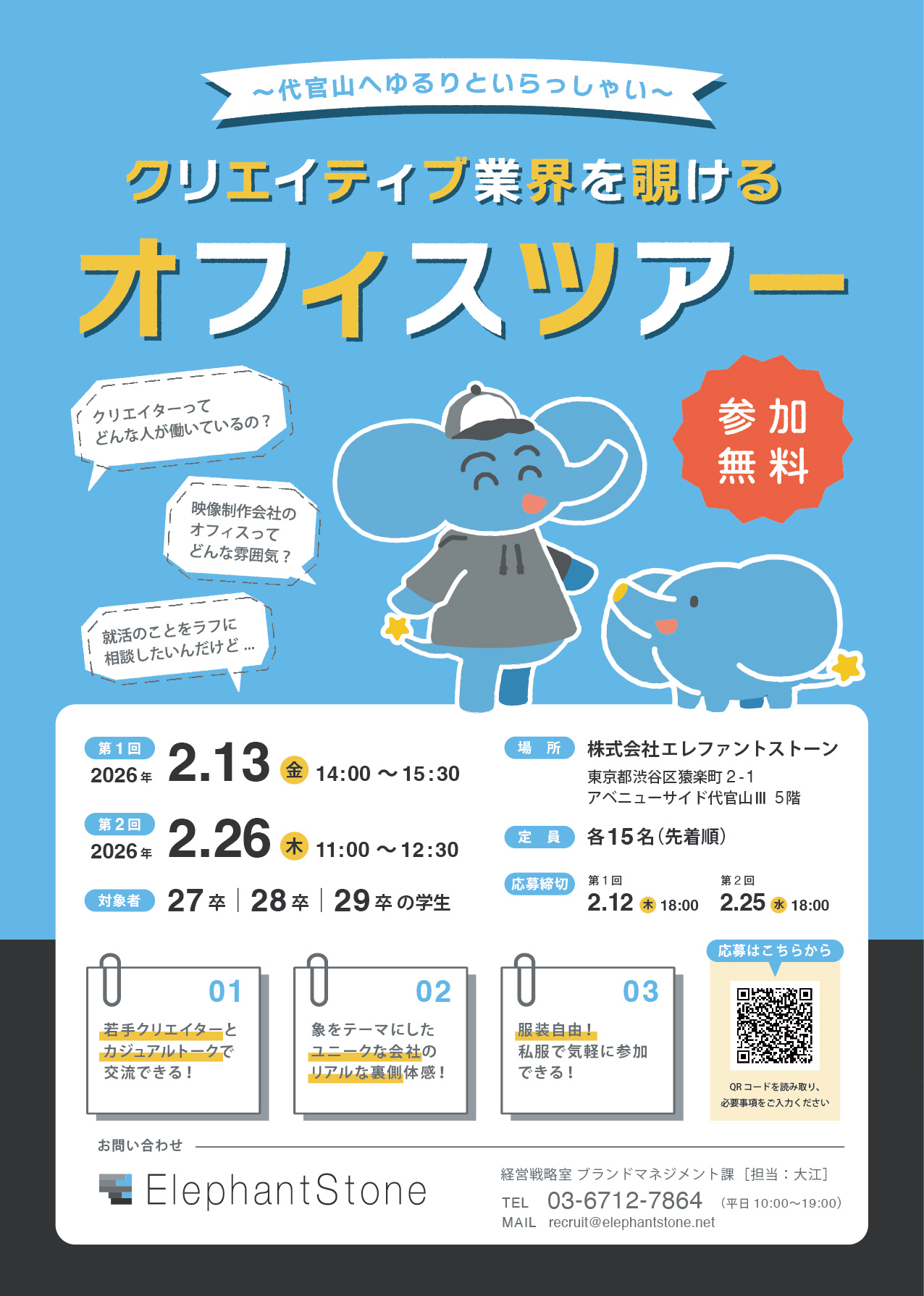 この度エレファントストーンでは、27卒・28卒(29卒も可)の学生の皆さまに向けて「オフィスツアー」を開催いたします!
